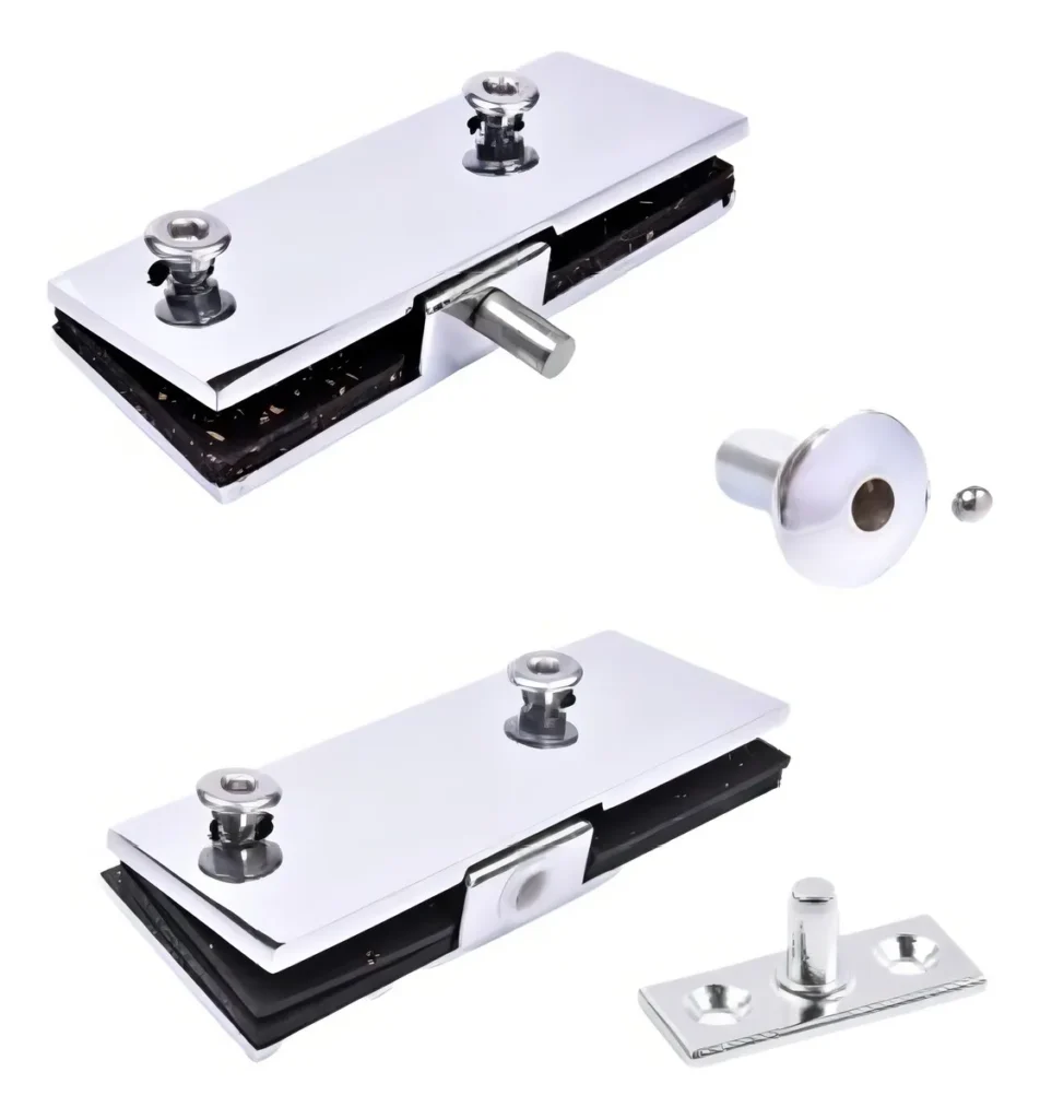 Kit Dobradiças para portas de vidros. Kits projetados para suportar o peso e a pressão do vidro temperado. Trazendo fixação, fechamento suave e durabilidade.